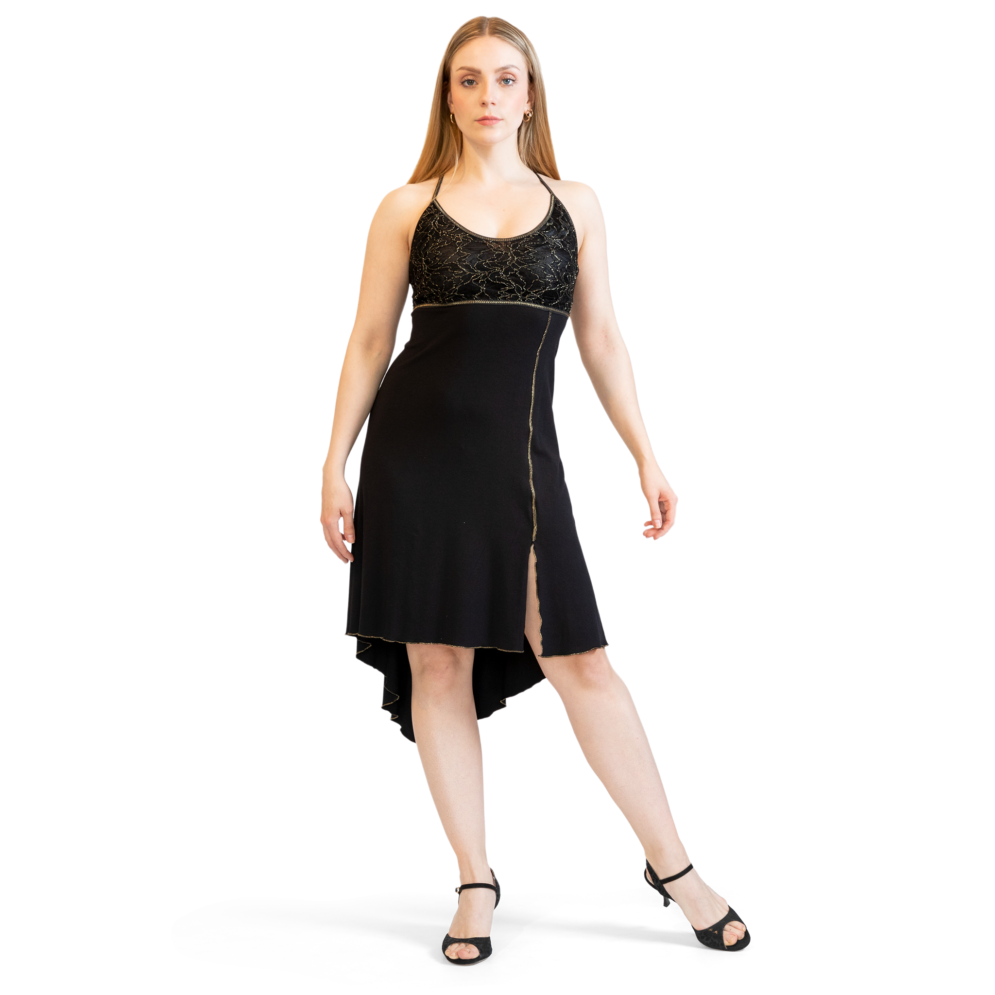 Gustango Serena • Schwarz-Gold Tanzkleid, dünne gekreuzte Träger