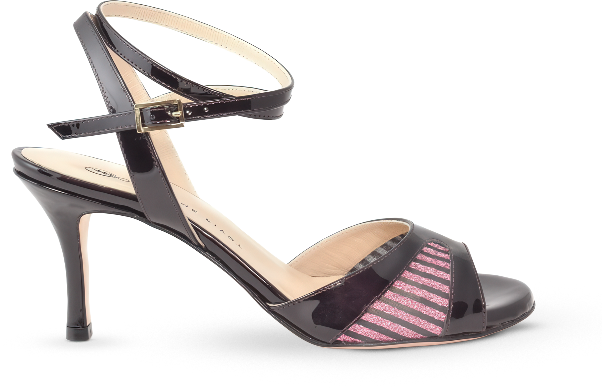 Der Madame Pivot Thelma in Burgundy Patent + Glitter Net ist eine Tanzsandale aus weinrotem Lackleder. Die offene Ferse wird von einem schmalen Fersenriemen und dem Fesselriemchen ergänzt. Letzteres kann um die Wade getragen werden, oder unter der Sohle durchgeführt.